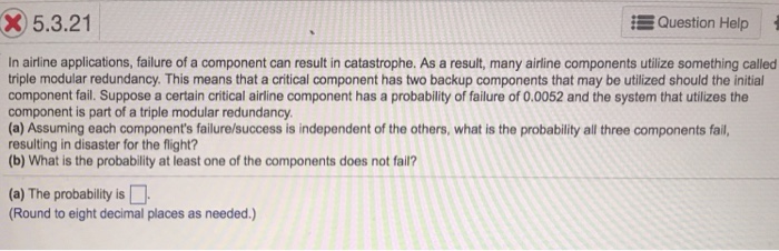 Failures of the components can lead to a system failure. As a result many airline components utilize something called triple modular redundancy. Statistics and Probability questions and answers.